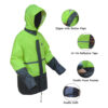 Features: Eco-Friendly, Breathable, Comfortable, Durable, Anti-Pilling, Anti-Static, Waterproof, Lightweight & Packable, High Visibility, Double Entry Front Pockets, Front Zip with Snap Storm Flap, Stowable Hood, Unisex Design